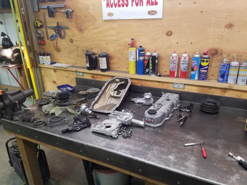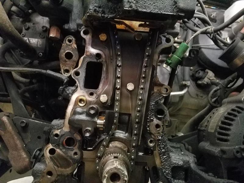 So jumped back to the front of the runner. It had a nasty oil leak and I knew the front cover was cracked. Pulled the pan and cover and the chain/metal backed guides are in great shape.