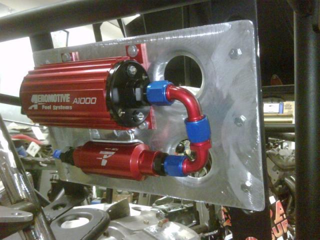 A Holley "lift" pump feeding an Aeromotive high pressure pump. The Holley is mounted below the cell to help get a siphon effect going. I think I'm going to build a small light weight skid plate to protect it from the odd branch and/or rock that finds it way up there.