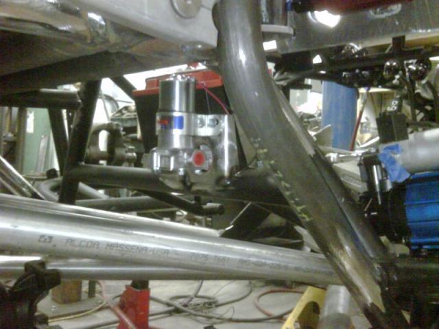 Started mounting some of the stuff needed to make this thing run. I've upgraded to a bigger transmission cooler which wouldn't fit in the old ones spot so that gave me some much needed real estate for the fuel system stuff. I decided not to mess around with the fuel system. Fuel pump issues caused us major headaches during the Vegas to Reno race in the 115 deg heat. DSI did some research, made some phone calls and put up the $ to test out a better fuel system.