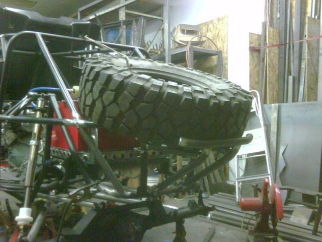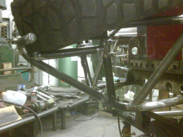Got a bunch of stuff done, not to many pictures. My buddy Colin got the new exhaust stuff all tig'd up, front shock reservoir mounts made. I got the rear reservoir mounts done, took JasonC's idea for his mounts on his KOH buggy and ran with it. A couple pics of the start of the spare tire carrier. Its bolts on, so I'll be pulling off for trail wheeling and rockcrawling comps.