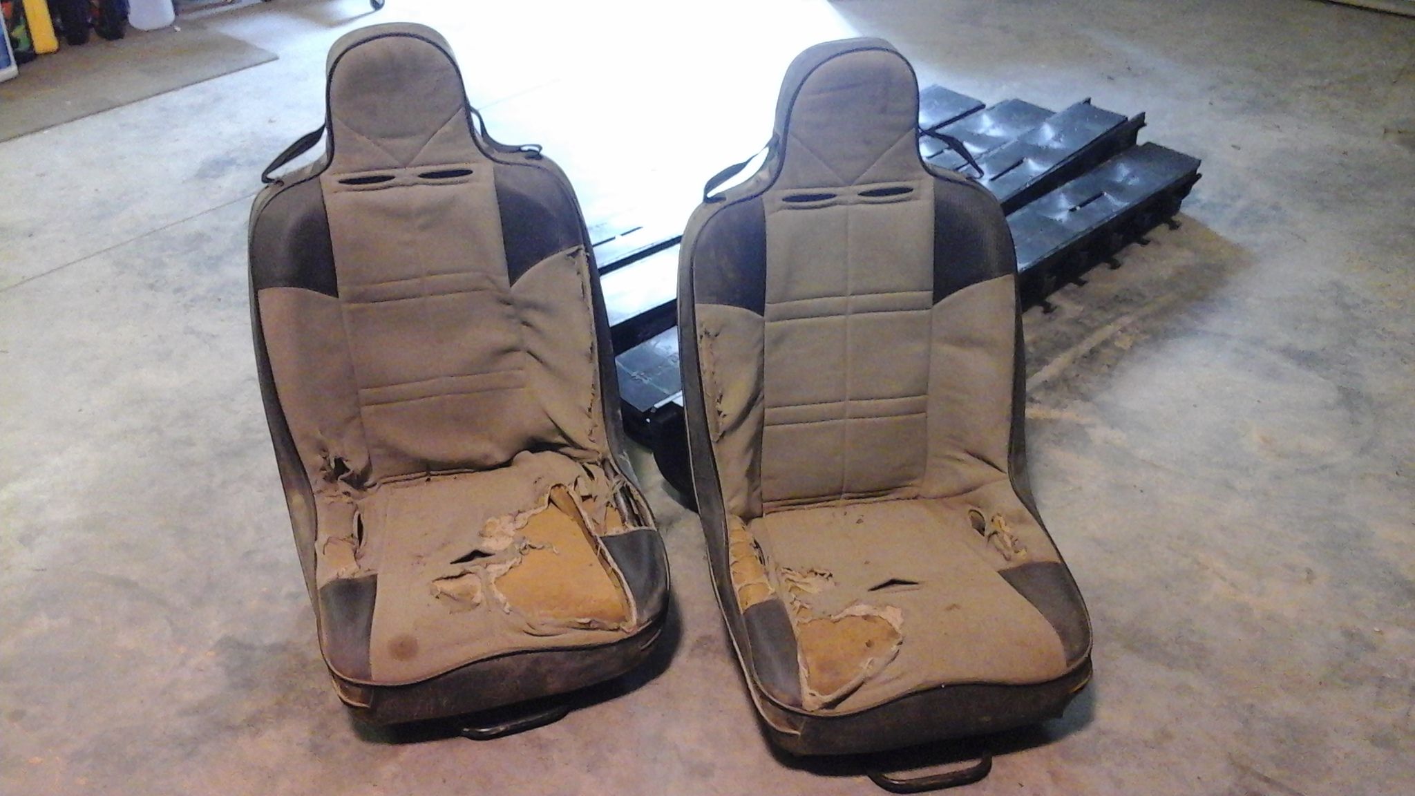 2 used Suspension seats. The covers are hammered,, but the suspension is good. I replaced these with the Garage Pro brand are are just about the same. Guessing some sear covers for Walmart would make them look fine.