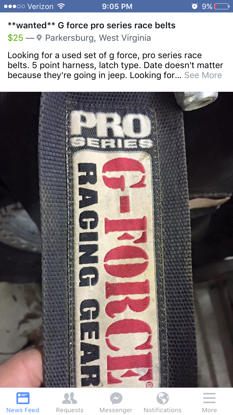 Looking for a set of 5-point, black, g-force pro series harnesses like in picture to match the one set I have. Contact me at 304-991-2979.