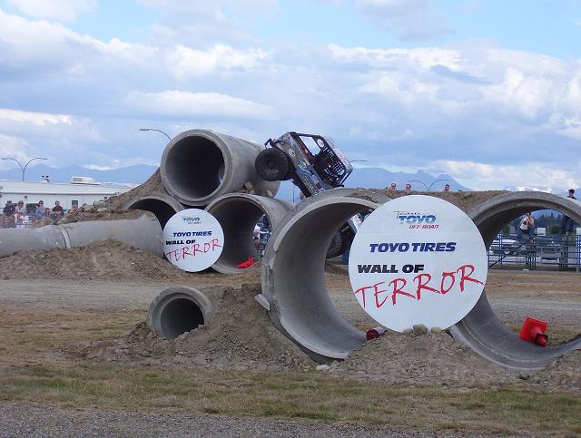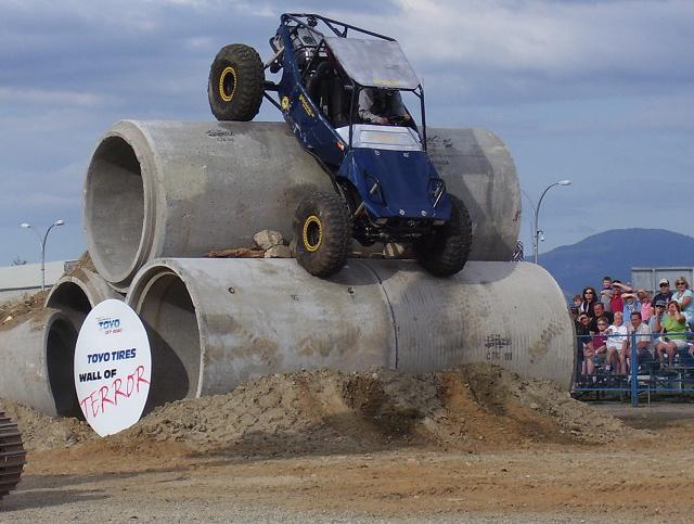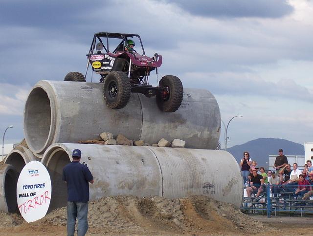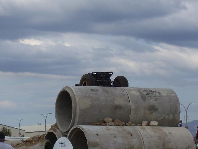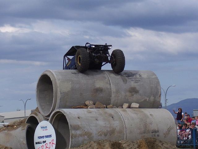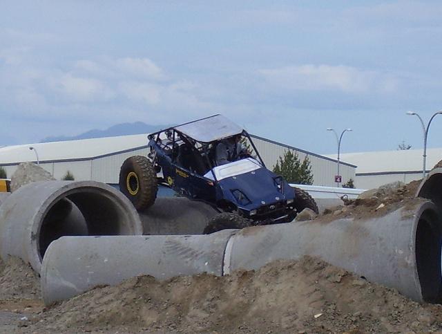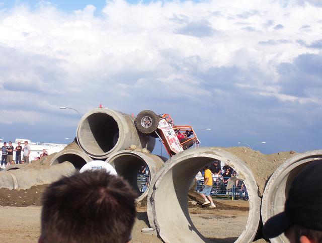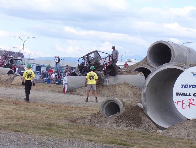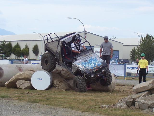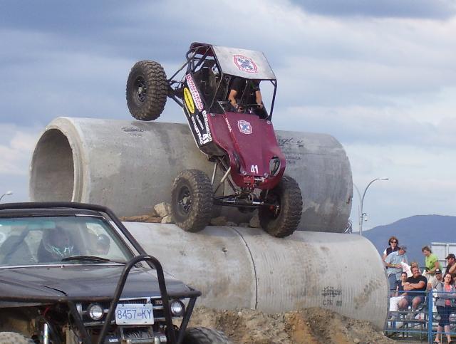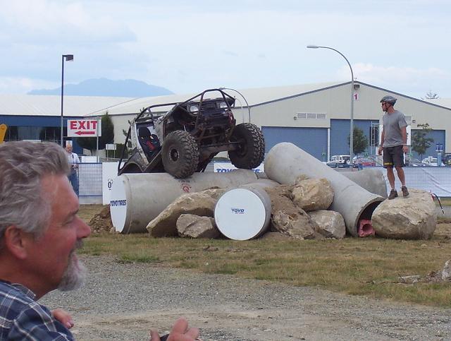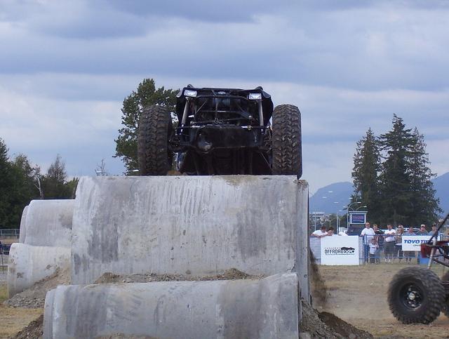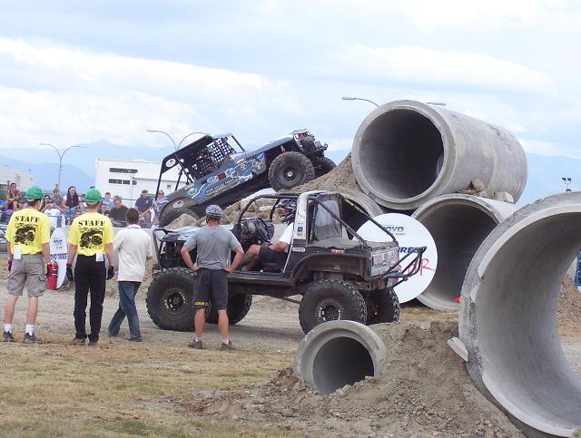 a bad ass jeep from the pro mod. class going over the top on Friday, ended up shearing all his king pin studs on the drivers side, pulled the broken studs out and reinstalled borrowed studs and his "C" and was good to go the next day. He also ended up rolling of the edge of one of the 8' culverts on sunday morning twice, the second one he hit hard on the drivers side and slammed his shoulder in the ground and was done for the day, he was leading the pro mod class at that point.