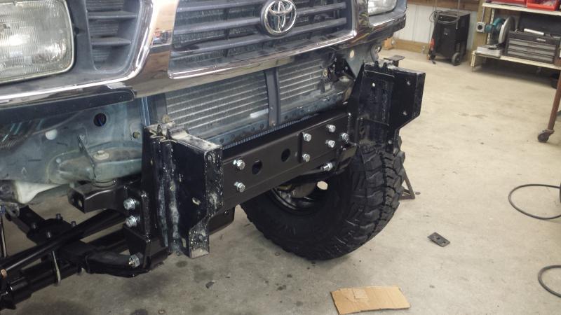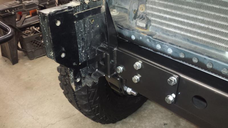 I got the mounts burned onto the new plates. Once thing I didn't like was the distance from the bolts to the outer edge of the mounts--I was afraid they would bend under a hard pull. I ended up drilling/tapping the side of the new cross member and adding 2 tabs. That should do the trick and the bumper is now an easy 10x stronger than it was in its original form.